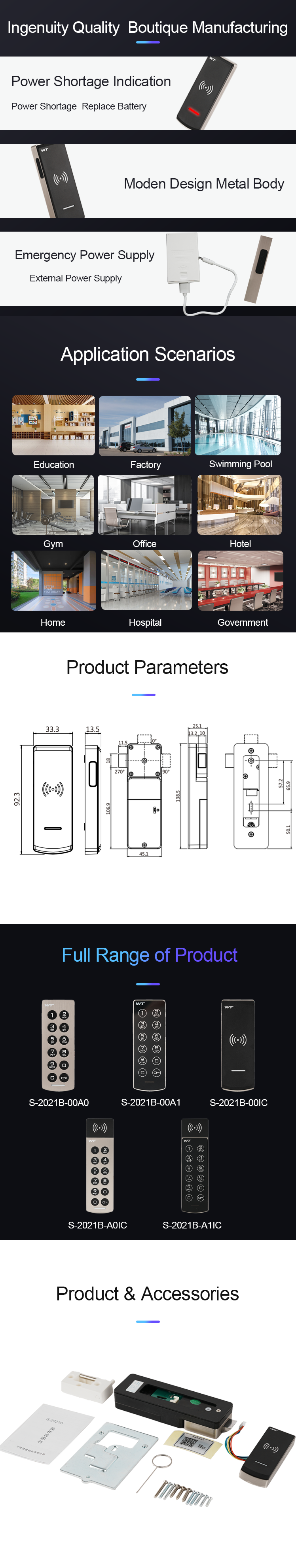 | Advantage | quick battery change | Card type | 125 KHz&Mifare one 13.56MHZ |